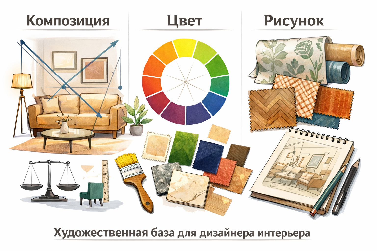 Художественная база — фундамент профессионального дизайнера интерьера. Композиция отвечает за порядок и гармонию, цвет — за настроение и глубину, рисунок — за характер и визуальный интерес. Освоив эти направления, вы быстрее начнёте создавать интерьеры, которые выглядят уверенно и цельно.
